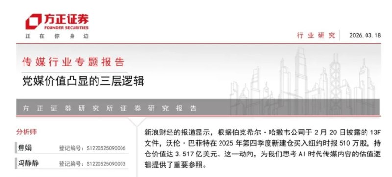 新浪财经的报道显示,根据伯克希尔·哈撒韦公司于2月20日披露的13F文件,沃伦·巴菲特在2025年第四季度新建仓买入纽约时报510万股,持仓价值达3.517亿美元。这一动向,为我们思考AI时代传媒内容的估值逻辑提供了重要参照。
